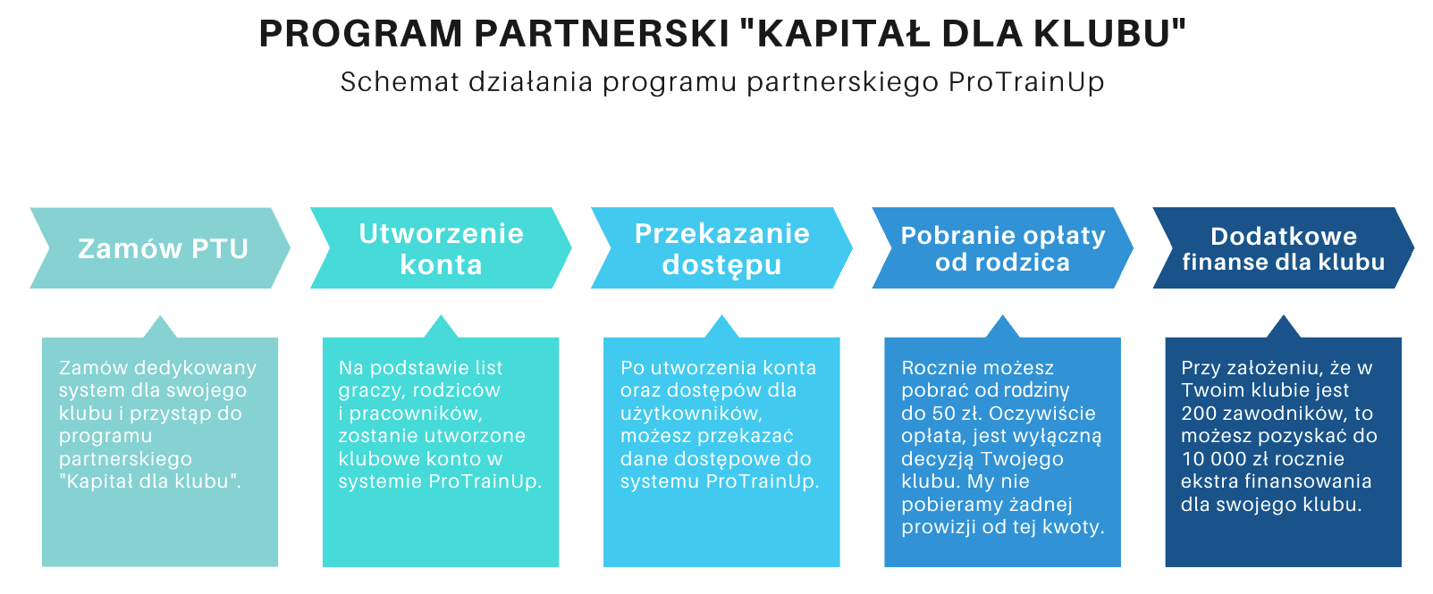 Cílem tohoto programu je přesunout 90% klubových poplatků placených klubem či rodiči do ProTrainUpu. Tím, že uzavřete dohodu s ProTrainUpem, se klub stává administrátorem všech přístupových údajů a hesel pro rodiče a hráče. Roční náklady pro přístup hráče a dvou rodičů se pohybují dle zvolené licence od 15 EUR to 25 EUR. Klub se může samozřejmě vzdát poplatků rodičů a hráčů za přístup do systému.
